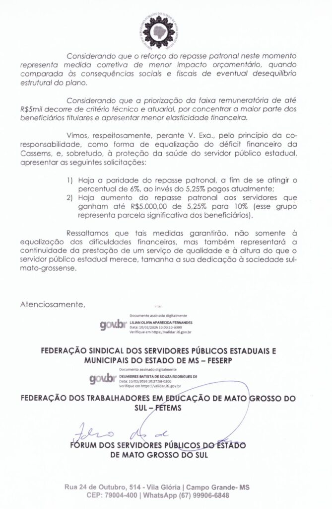 O ofício está agora nas mãos do governador Eduardo Riedel e do presidente da ALEMS, Gerson Claro. Para Fabiano Reis, o papel das entidades foi cumprido com rigor técnico e político: “O Fórum dos Servidores, junto com sindicatos e federações, segue fazendo o seu papel e cobrando o que é justo. Fomos bem recebidos, com diálogo aberto, mas agora precisamos de ação”. A expectativa é a abertura rápida de uma mesa de negociação para evitar o agravamento da crise e garantir o atendimento médico a milhares de servidores e seus familiares.